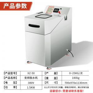 XZ-50型脱水机,蔬菜脱水食品甩干,变频控制、方便快捷。速度调频,脱水速度可根据不同产品需求调节不同速度。钣金机身,机架钣金是 2MM 厚,使整机运行时更稳定,噪音更小。