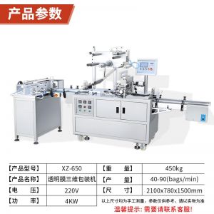 XZ-650包装机,三维包装机,全自动化操作出膜、切膜、包膜、热封一次完成。可广泛应用多种产品,适用包装的产品有食品、扑克牌、香烟盒化妆品、日用品、文具用品等类型产品。