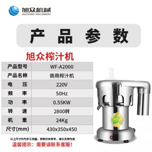 WF-A2000商用榨汁机,该机所榨出的汁液是现榨的原汁,不含任何人为的防腐剂、稳定剂、色素、香精、水等,凡与榨汁接触的原件均为不锈钢和无毒塑料聚丙烯和 A.B.S,食用安全。
