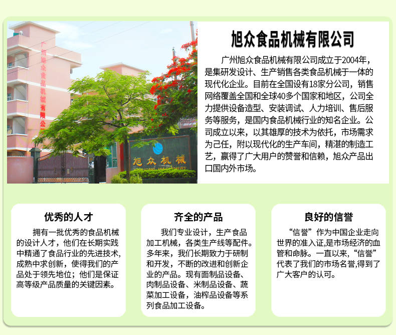 广州萝卜视频高清观看免费下载食品机械有限公司是一家集科研开发,生产设计,营销服务为一体的现代化生产企业。现代化生产车间,精湛制造技术,所产机械历经市场重重考验,不断赢得海内外客户的赞誉。