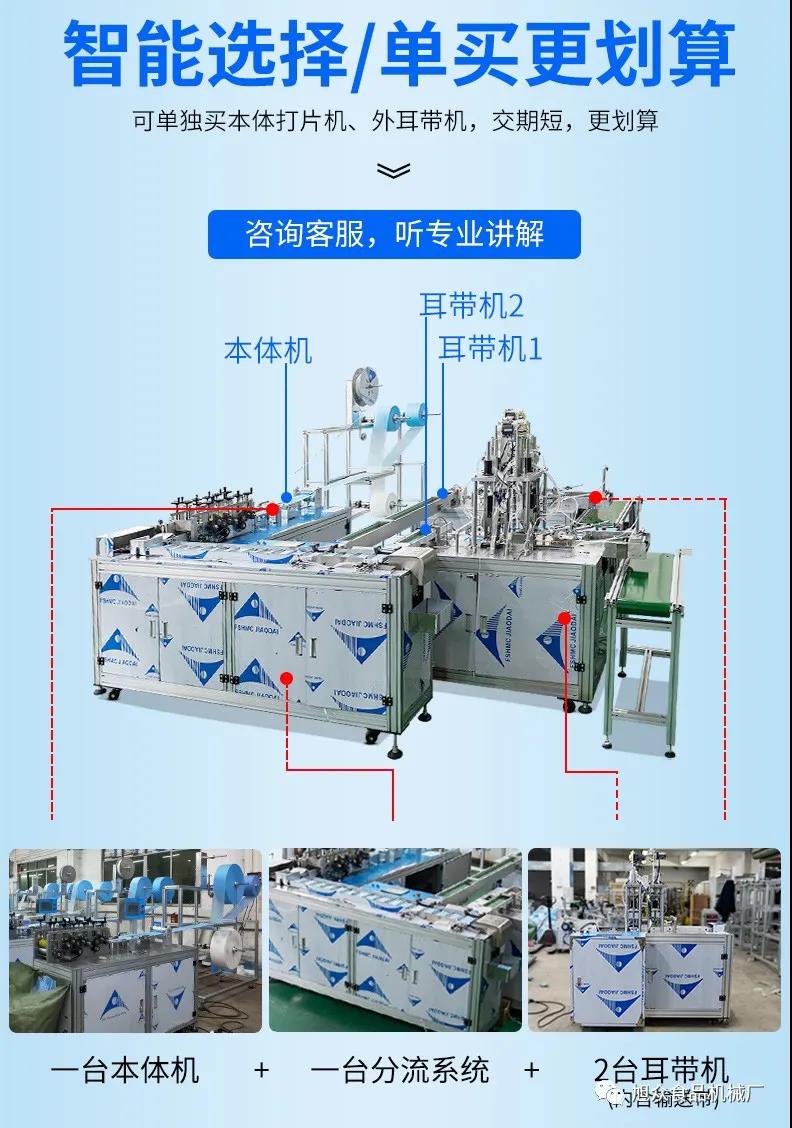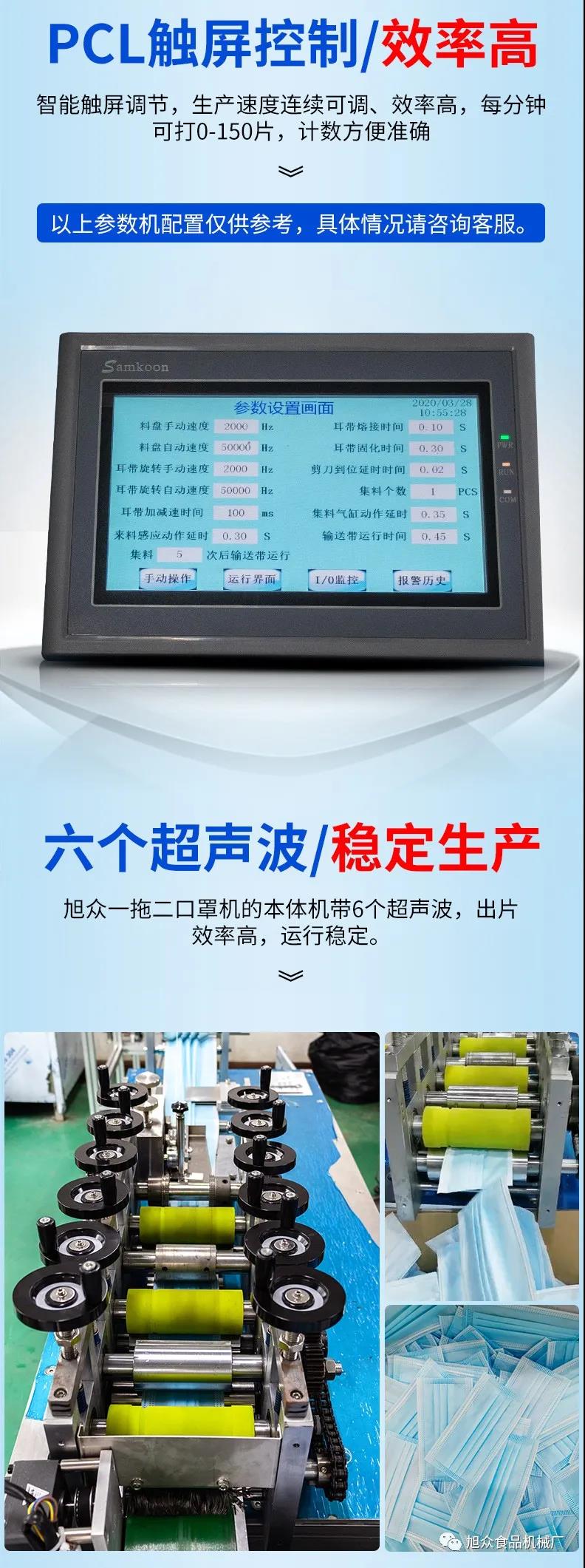 萝卜视频高清观看免费下载牌一拖二口罩机由一台本体机带动两台耳带机组成。本体机输出ロ罩本体后,由输送带结构将口罩本体片输送到连接耳带机的输送带上,再通过输送带将口罩片输送到耳带机的正面第一个口罩盘上方,最后通过气缸下压把口罩片放置到耳带机的口罩盘内,后续由耳带机完成口罩的耳带熔接,包边等动作,从而完成一个耳带口罩产品的生产。本机采用PLC、触摸屏控制、主传送带采用单相马达输送、步进马达翻转,传动精确,控制稳定,速度可调。