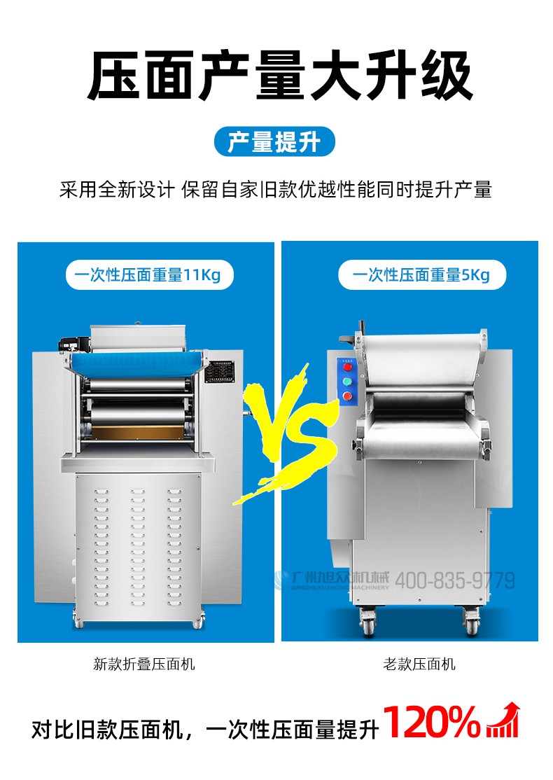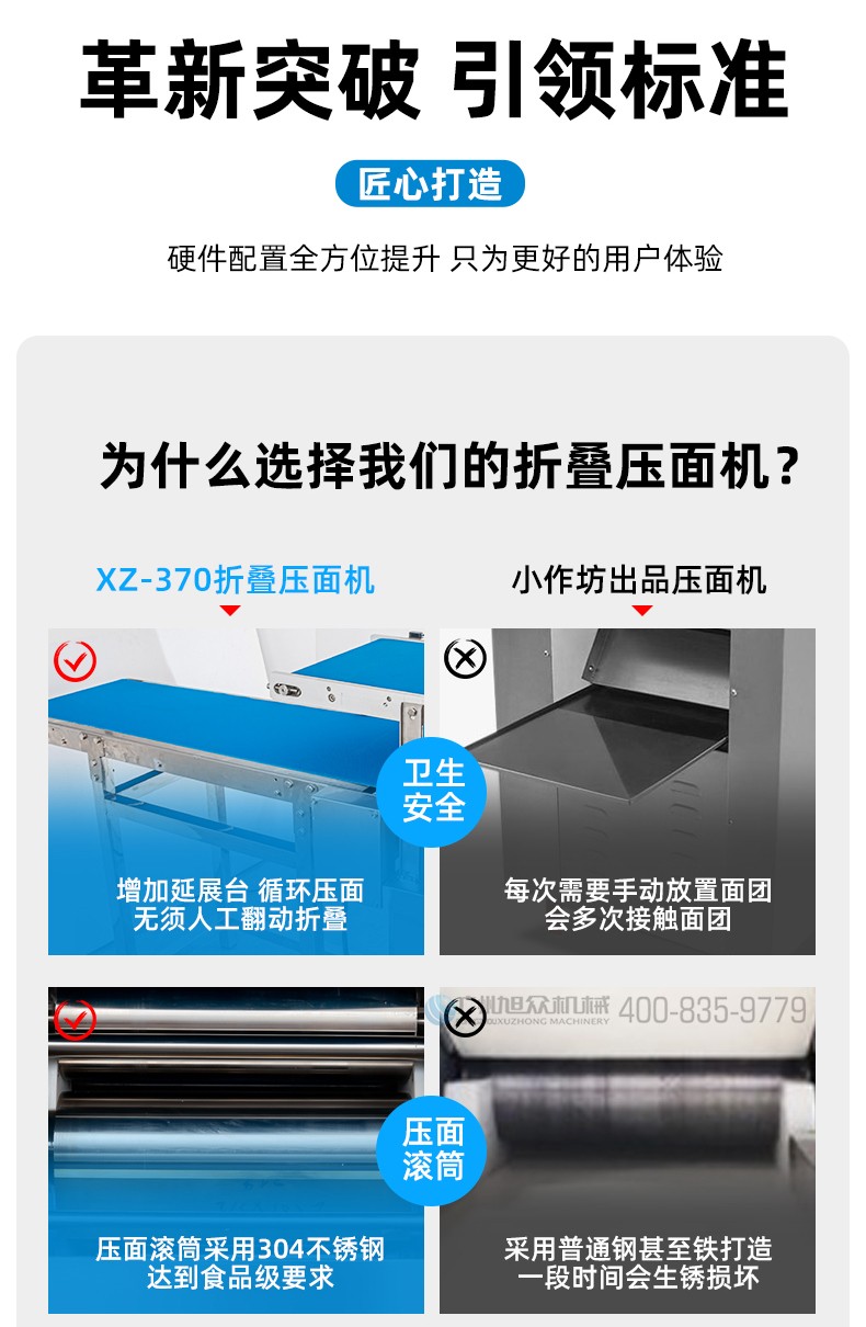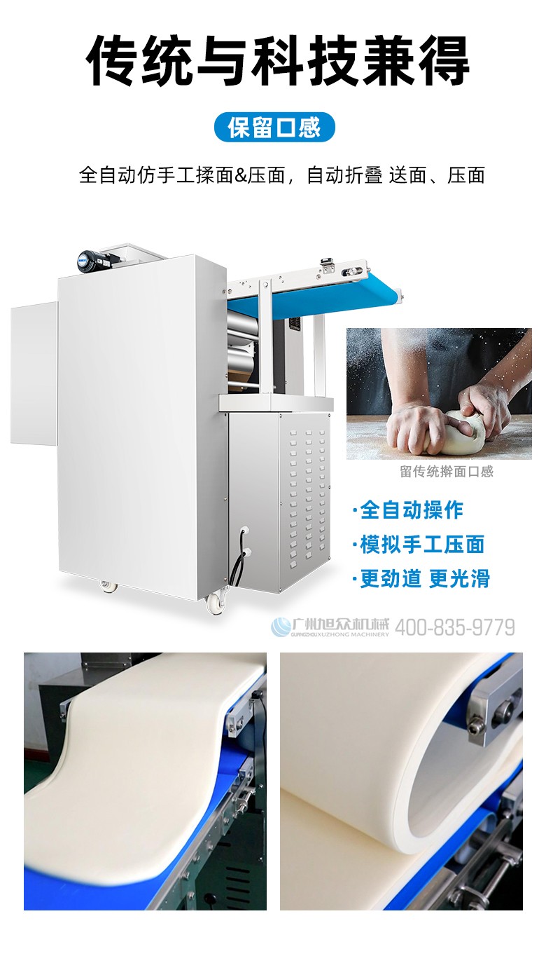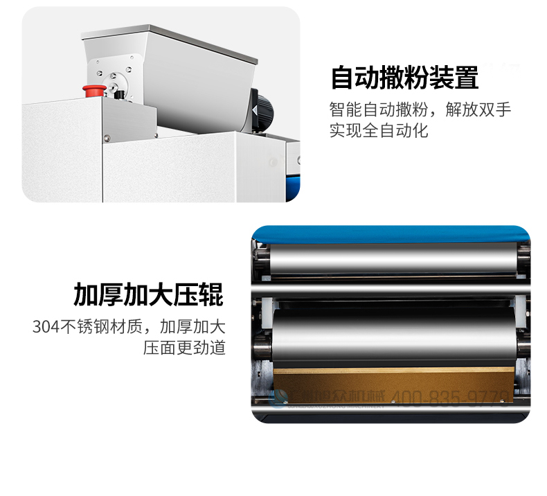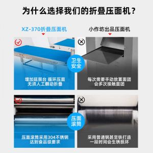 XZ-ZDYMJ370型自动折叠压面机,整机不锈钢机身打造,真材实料,选用不锈钢材质,打造经久耐用、防腐蚀。匠心细节,彰显品质贴心设计。一键设定压面次数,智能定时,只需设定好压面次数,就能全自动压面出面。