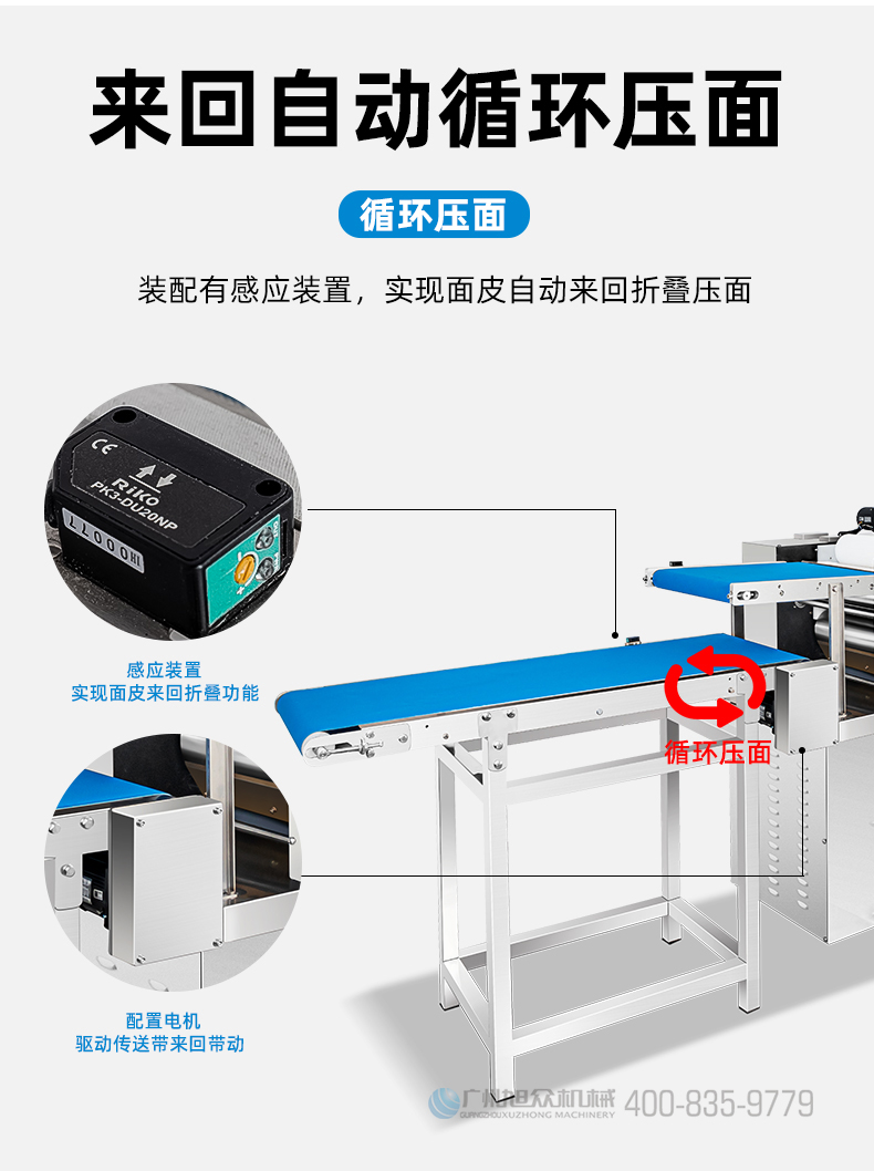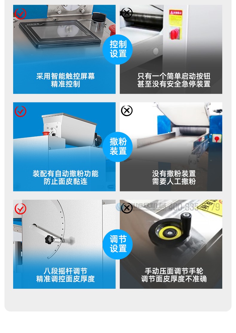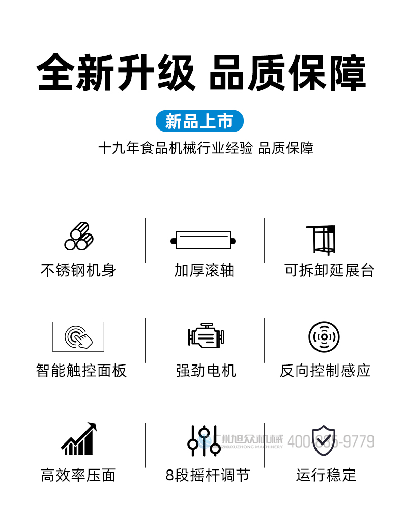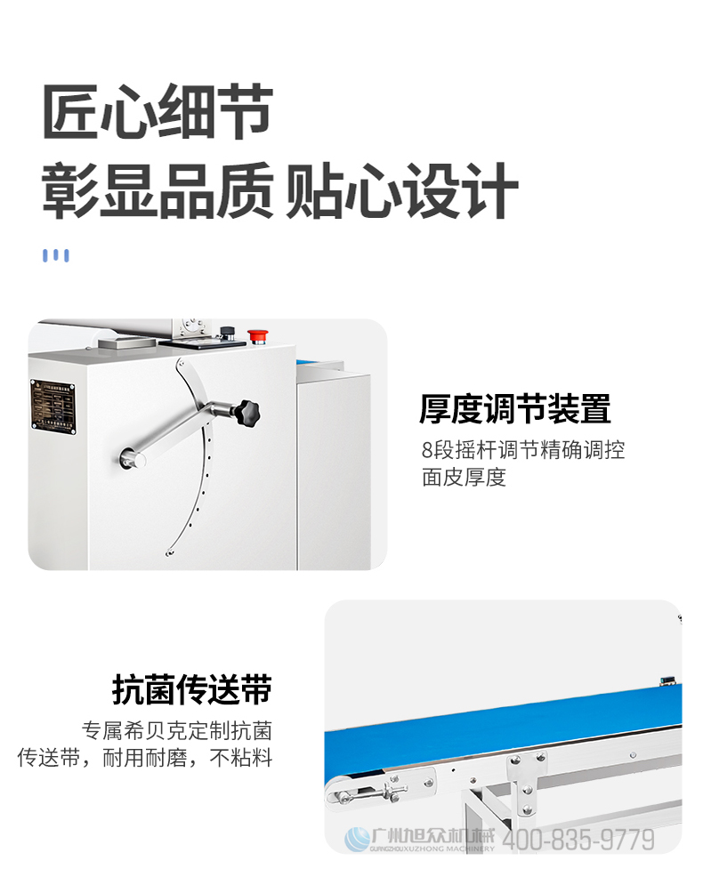 XZ-ZDYMJ370型自动折叠压面机,整机不锈钢机身打造,真材实料,选用不锈钢材质,打造经久耐用、防腐蚀。匠心细节,彰显品质贴心设计。一键设定压面次数,智能定时,只需设定好压面次数,就能全自动压面出面。