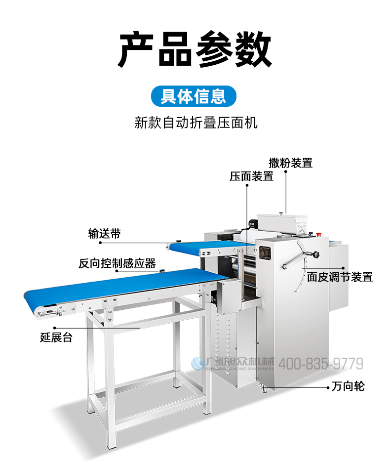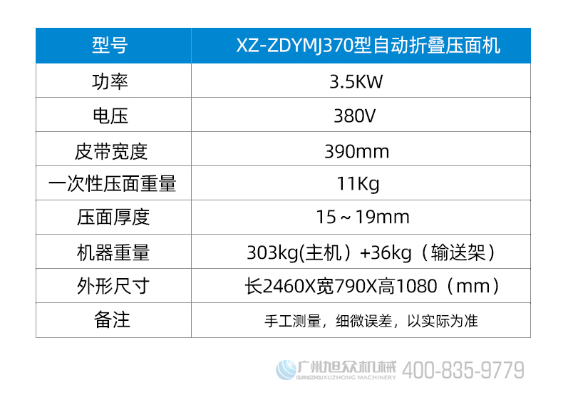 名称XZ-ZDYMJ370型自动折叠压面机 电源380V 功率3.5KW 产量一次性压面重量11kg 尺寸2460X宽790X高1080(mm) 重量机器重量303kg(主机)+36kg(输送架) 规格压面厚度15~19mm 其他皮带宽度390mm